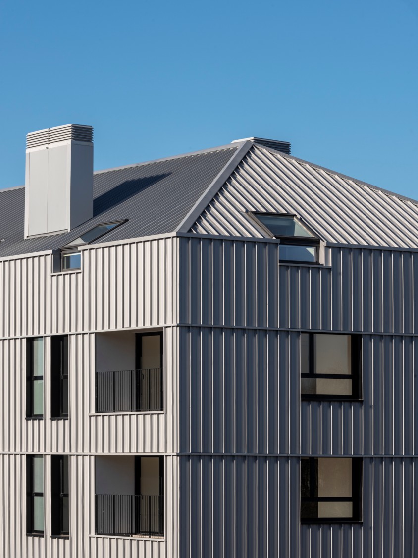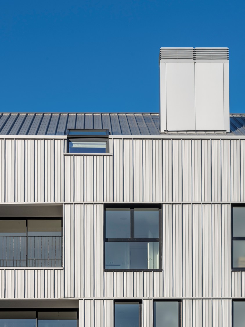 Además, la continuidad entre fachada y cubierta refuerza la estanqueidad del sistema y permite una lectura arquitectónica unitaria, donde envolvente, volumen y eficiencia energética se integran en una misma estrategia de proyecto..