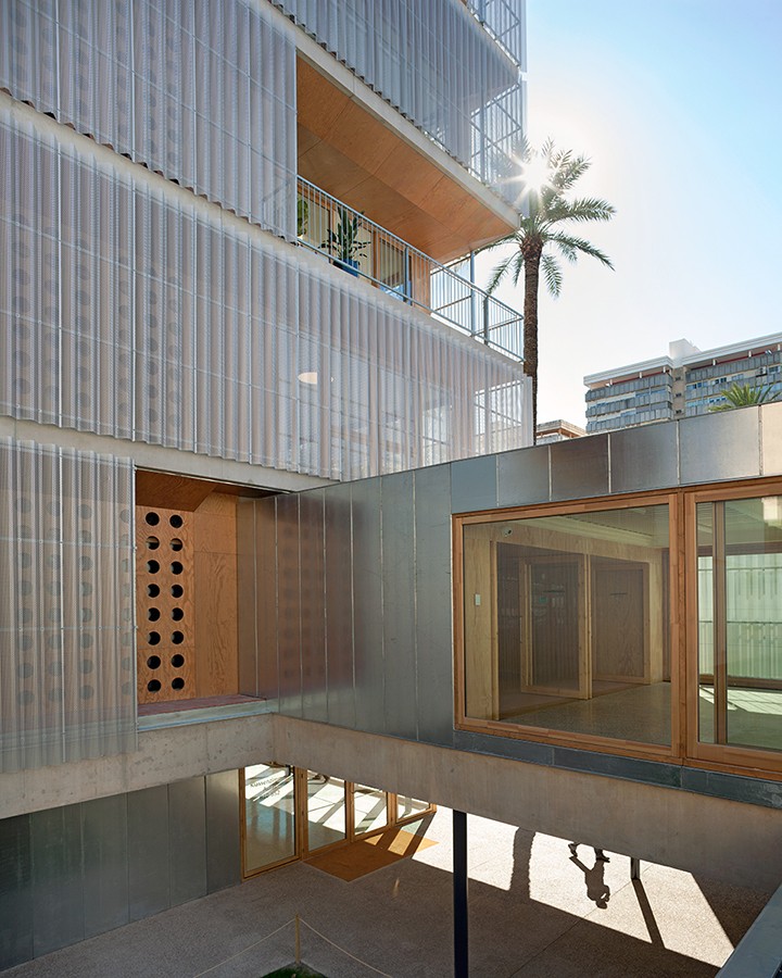 La elección de materiales reciclados y el cuidado en el diseño de la envolvente contribuyen a reducir la huella ambiental del edificio, al tiempo que refuerzan la durabilidad y el bajo mantenimiento de la fachada metálica.