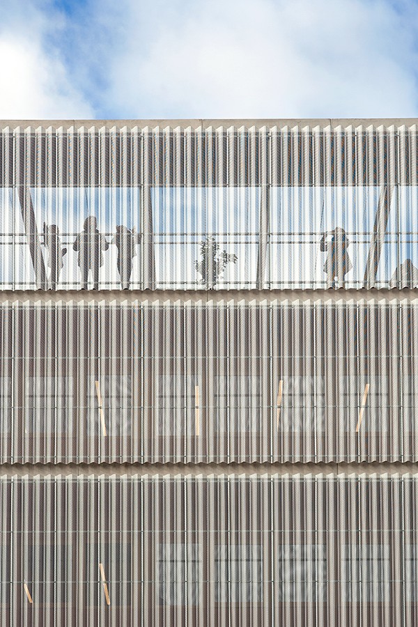 Para el revestimiento de la fachada se desarrolló un perfil grecado de fijación vista ad-hoc para este proyecto (Envolventes personalizadas de Europerfil). Un perfil en aluminio perforado R10T14 post anodizado, de geometría piramidal de gran canto, que genera volúmenes y sombras que dinamizan la percepción del edificio. Esta solución permitió jugar con la luz natural y aportar un lenguaje arquitectónico contemporáneo, coherente con la identidad del centro educativo y su entorno.