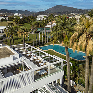 KE en la terraza panoramica del club de golf en la playa de Marbella, perla de la Costa del Sol