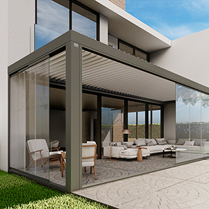 Gama LLAZA de pérgolas bioclimáticas Majestic y cierres acristalados NUNA