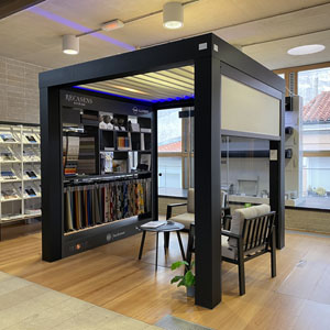 El espacio expositivo de RECASENS GROUP en MATCOAM, de 10 m2, está pensado para que los profesionales puedan ver y tocar en persona tanto los tejidos como los sistemas de toldos y pérgolas de protección solar. El showroom consta de una pérgola bioclimática completa con sus cierres laterales de tejido y cortina de cristal, 3 toldos cofre motorizados con luz LED, 5 secciones de toldos, muestras de lacados, muestras de tejidos y todos los catálogos de producto de las dos empresas.