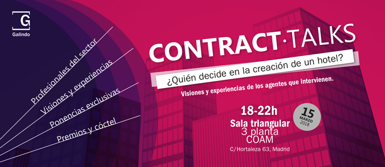 Contract-Talk es un espacio para la arquitectura y diseño: Visión de futuro y tendencias, Ambientes únicos para optimizar el Costumer Experience; Construcción, normativas, materiales y certificación; Importancia de las nuevas tecnologías en el desarrollo del proyecto; Sostenibilidad vs Diseño; Equipamiento especializado, el papel del distribuidor, etc.