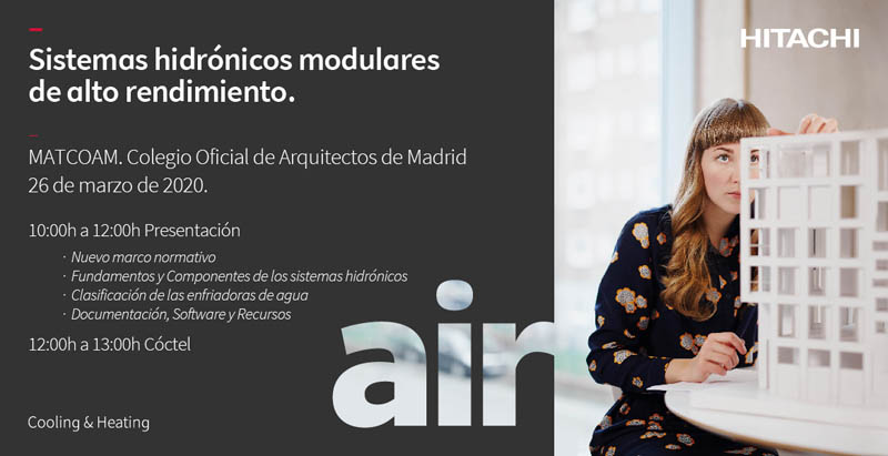 El próximo jueves 26 de marzo tendrá lugar en la sala el altillo del Matcoam, de 10:00h a 13:00h la jornada Hitachi Cooling & Heating sobre Sistemas hidrónicos modulares de alto rendimiento, donde se tratarán temas como el nuevo marco normativo y  las ventajas de los sistemas hidrónicos , además de cómo sacar el máximo rendimiento a través del software.