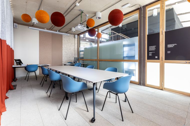 Uno de los elementos clave de la sala son los paneles acústicos aplicados en la pared central, que no solo mejoran la acústica del espacio, sino que muestran la variedad de soluciones y acabados de la firma. A su vez, la cortina bicolor añade un toque de calidez, mejora la acústica y regula la entrada de luz natural, y en techo, las esferas acústicas acondicionan el espacio aportando diseño y originalidad. Un conjunto de soluciones para crear un entorno equilibradode confort y bienestar.