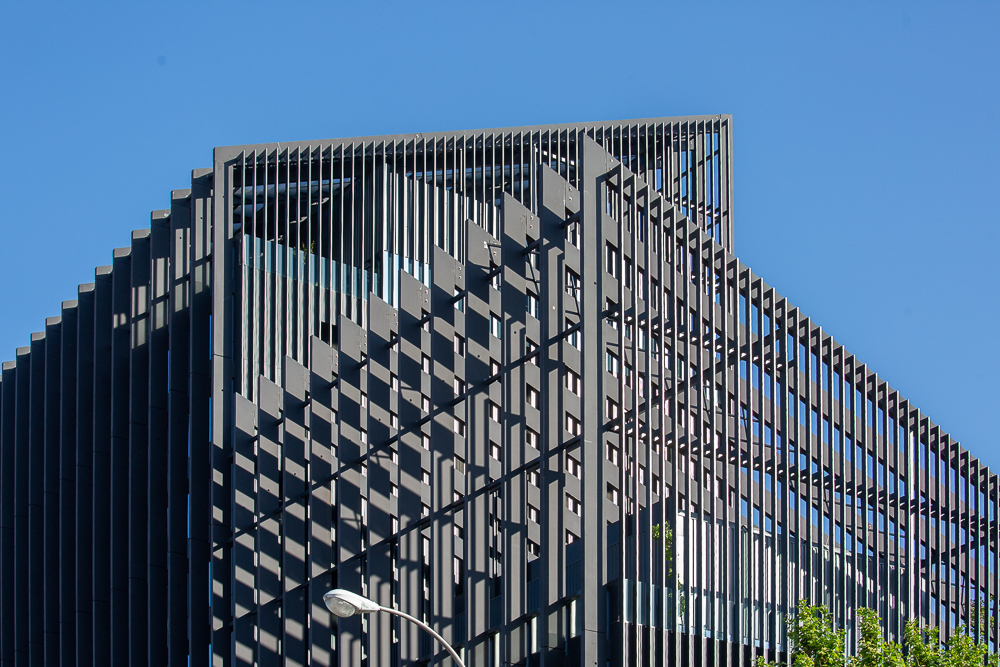 El envoltorio arquitectónico negro de los edificios consiste en una construcción acanalada de elementos prefabricados de hormigón que se extiende verticalmente a lo largo de los edificios.