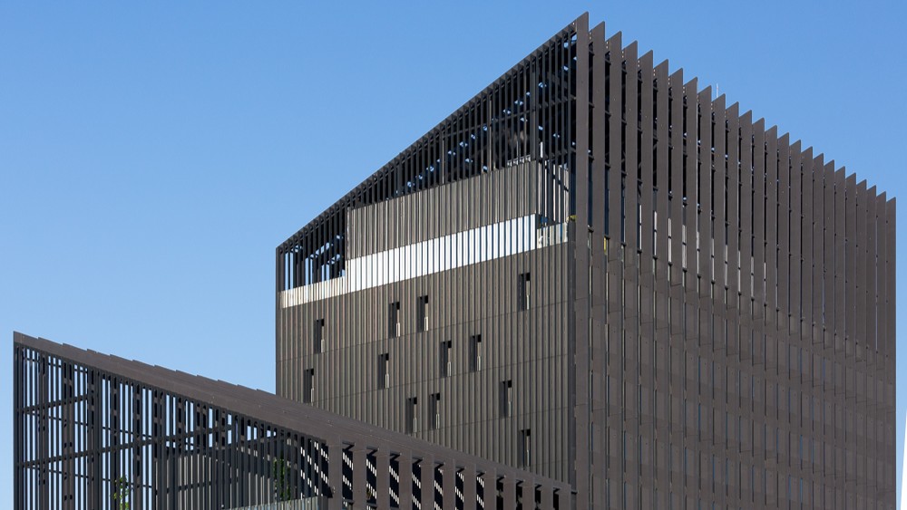 El envoltorio arquitectónico negro de los edificios consiste en una construcción acanalada de elementos prefabricados de hormigón que se extiende verticalmente a lo largo de los edificios.