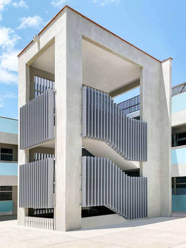 Las lamas de aluminio extrusionado O-300 dibujan un muro cortina en diferentes colores, que aporta dinamismo a este centro educativo, y permite un adecuado control lumínico, necesario para crear un ambiente confortable dentro de las aulas.