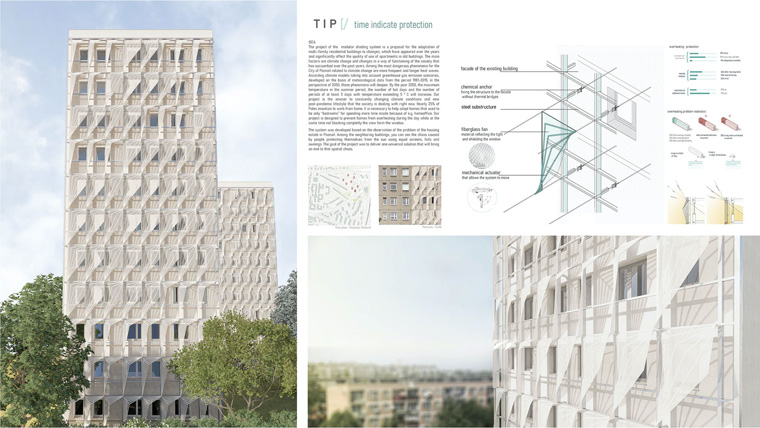 El proyecto propone un sistema modular de sombreado para la adaptación de edificios residenciales que responda a las condiciones climáticas en constante cambio y a los nuevos estilos de vida pospandémicos. La estructura se ha diseñado de forma que proteja el interior del sobrecalentamiento, pero al mismo tiempo permita la entrada de luz natural.