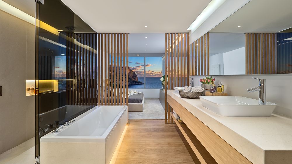 Las viviendas de New Folies ofrecen interiores amplios y lujosos, con superficies habitables que oscilan entre los 240 m2 y los 370 m2, sin contar terrazas, sótanos y piscinas privadas. Los espacios abiertos y las vistas directas al mar se complementan con detalles de diseño como las láminas verticales de separación, que aportan privacidad sin renunciar a la entrada de luz natural.
