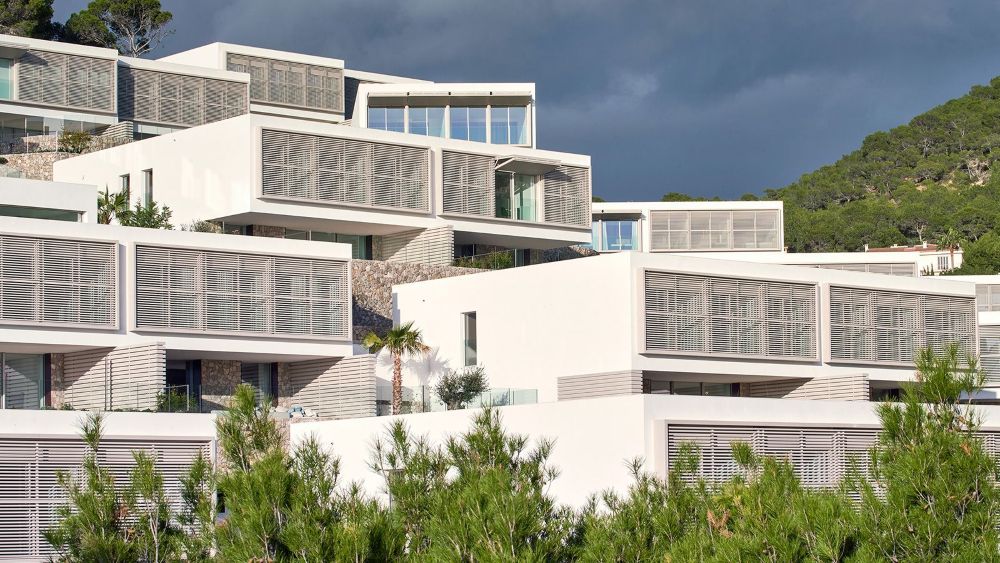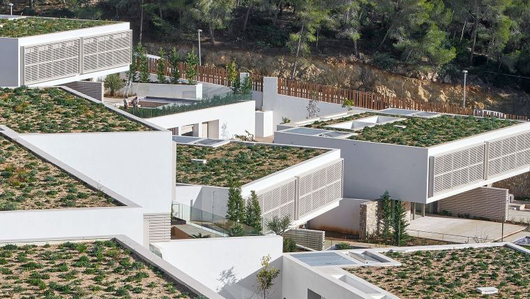 La solución fue un diseño escalonado en terrazas, permitiendo que cada una de las 38 casas adosadas y 3 viviendas unifamiliares disfrutarán de vistas despejadas hacia la bahía azulada. Cada vivienda cuenta con su propia piscina, y además se dispone de una gran piscina comunitaria y una generosa terraza para tomar el sol. Todos los edificios son planos y la mayor parte de ellos está integrada en la topografía. Por lo tanto, ninguna de las viviendas obstruye las vistas de las demás a la azulada bahía, y los tejados planos verdes generan un entorno natural agradable.