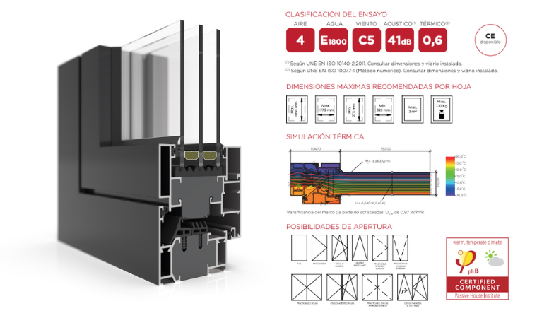 Actualmente, no solamente buscamos la estética del resultado final ante una obra sino que también debemos tener en cuenta el impacto ambiental que pueda llegar a causar en el mismo. Debemos resaltar que este sistema ha conseguido la certificación Passive House con una clase de eficiencia phB (una de las pocas carpinterías de aluminio con esa clasificación en el mercado). Un sistema revolucionario, que ya supera las más altas exigencias térmicas. Por ejemplo, en ventanas acristaladas puede llegar a valores de transmitancia de 0,67 W/m²K. Diseñada para herraje de canal de 16 y eje 13 con todas las opciones de apertura.