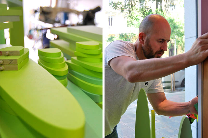 El trabajo de carpintería, cerrajería, pintura y acabados ha sido realizado por INSTORE, empresa presente en diseño, producción e instalación para retail y eventos presente en MATCOAM. Partiendo del diseño creativo de Kiki Van Eijk se ha desarrollado una producción personalizada en la que cada elemento se ha hecho a medida para poder recrear los escaparates siguiendo esas líneas de diseño. La madera lacada y el corcho pulido son materiales que funcionan muy bien en este tipo de escaparates ofreciendo un resultado final óptimo. Para la colocación de objetos ha sido necesario un trabajo de cerrajería invisible que permite instalar los elementos en la posición deseada. Este tipo de escaparates con objetos en 3D y diferentes capas o niveles de montaje permiten dar una sensación de profundidad y recrear escenarios imposibles de otra forma. El trabajo de visual merchandising en proyectos como este es fundamental, cada artículo ocupa un lugar determinado y preciso que forma parte de un todo definido a priori.