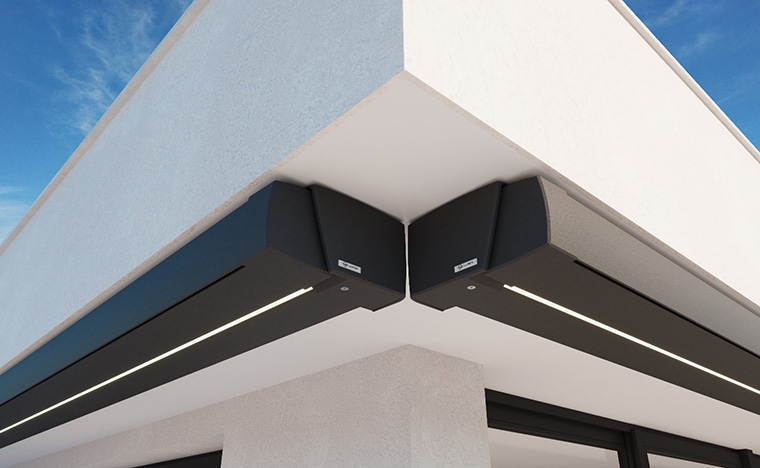 La integración del MATICBOX S-350 en espacios entre paredes y porches es impecable, gracias a sus tapas-soporte de aluminio y diseño plano que permiten la instalación de varios toldos en línea sin dejar espacio entre ellos. Esta característica no solo mejora la estética de la fachada, sino que también optimiza el uso del espacio de manera eficiente.