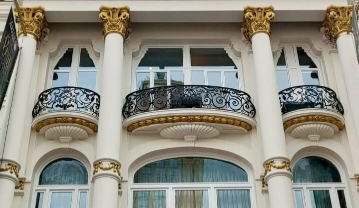 Para las ornamentaciones, se optó por KEIM Design-Lasur en colores metalizados (oro y bronce), aplicados tanto en cubriente como en veladura, dependiendo del nivel de detalle y el estado de conservación de cada elemento. Esta línea de productos aporta profundidad visual y un acabado metalizado estable en el tiempo, ideal para intervenciones donde se requiere una expresión estética controlada sin renunciar a la autenticidad material.